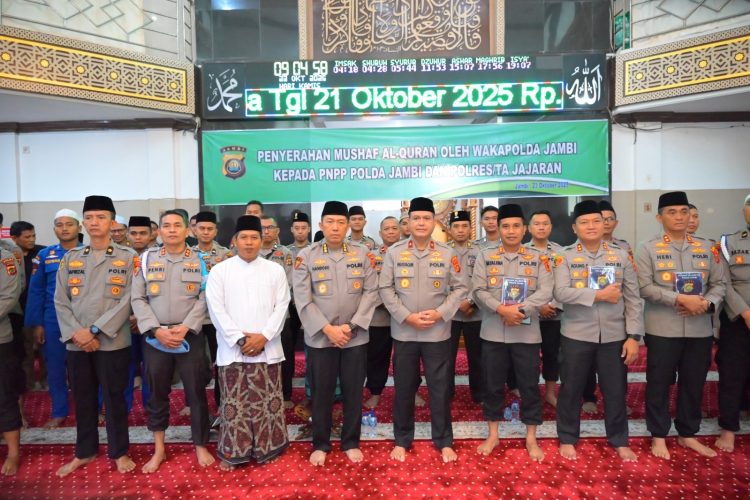 KATIGO.ID | KOTA JAMBI – Wakapolda Jambi Brigjen Pol. M. Mustaqim menyerahkan Mushaf Al-Qur’an kepada PNPP (Pegawai Negeri pada Polri) Polda Jambi serta perwakilan Polres/Ta jajaran, Kamis (23/10/2025)